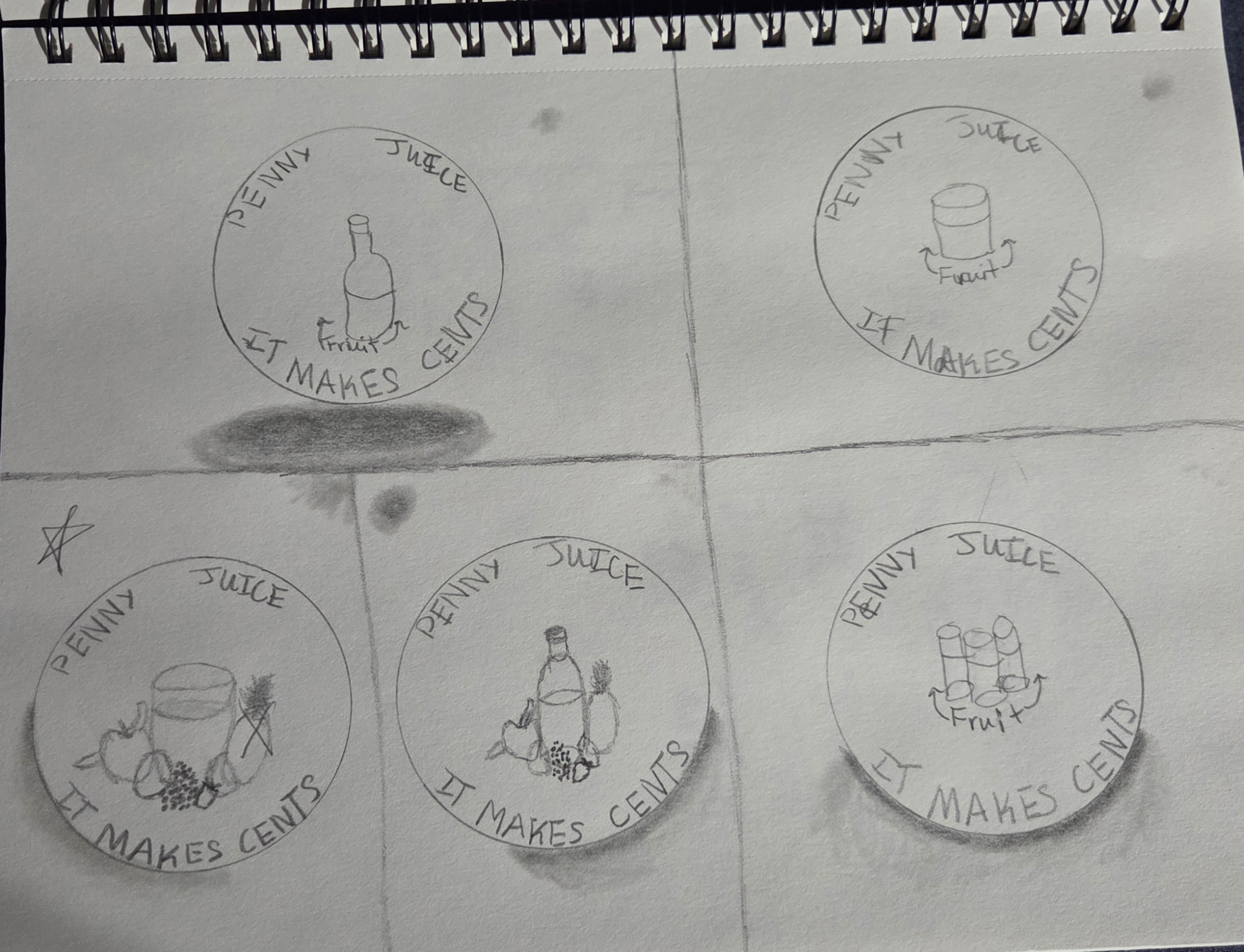 The logo has went through many stages. All the different sketches had the same base, but the middle changed. The feedback that I got back to use the cup and not the bottle in the logo. At the start of this redesign I made this plan to keep the early 2000s feel with the colors, but toned down. Also I had decided to keep the penny, but make the juice part the center of the design.